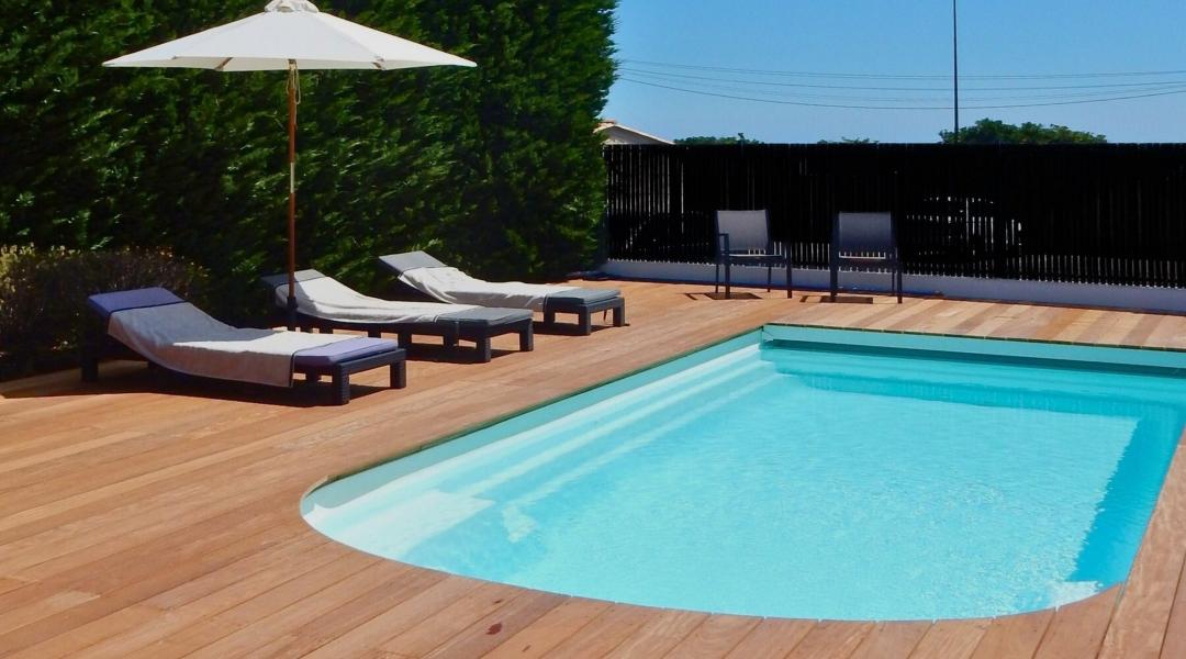 Schönes kleines Ferienaus direkt am Strand für bis zu 5 Personen. Mit eigenem beheiztem Pool mit geschlossenem Verdeck und geschützter Terrasse. Nur 100 Meter vom Strand La Nartelle gelegen. Restaurants, Cafés in Laufweite. Zwei Zimmer mit Klimaanlage.